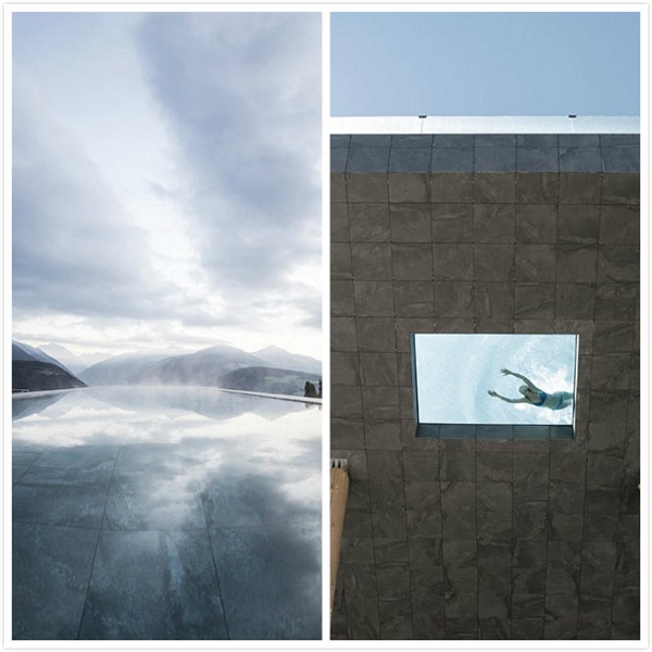 該泳池由建筑工作室Noa設(shè)計,其目的是模糊物理限制,與景觀交織在一起,利用鏡像云層和構(gòu)筑全景,給游泳者以在天地之間自由浮動的感覺。